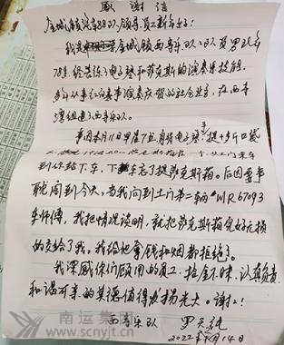 南運集團儀隴分公司駕駛員余友和物歸原主 收到《感謝信》