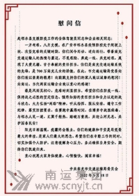 尊敬的市交通運(yùn)輸局黨委: 在投入鄰水緊張的抗疫工作間隙,我們南運(yùn)集團(tuán)奔赴鄰水抗疫一線的22名黨員先鋒隊(duì)駕駛員及領(lǐng)隊(duì),懷著激動(dòng)地心情傳達(dá)閱讀了市交通運(yùn)輸局黨委給我們發(fā)的既熱情洋溢鼓舞斗志,又充滿溫暖深情牽掛的《慰問(wèn)信》,讓我們勇氣倍增,更加堅(jiān)定了圓滿完成支援鄰水防疫任務(wù)的信心和決心,在此謹(jǐn)代表南運(yùn)集團(tuán)出征鄰水的全體黨員先鋒隊(duì)駕駛員及領(lǐng)隊(duì)向局黨委的親切關(guān)懷和暖心慰問(wèn)表示衷心感謝! 請(qǐng)局黨委放心,我們?cè)卩徦挂咭痪,一定不忘初心,牢記使命,只爭(zhēng)朝夕,不負(fù)韶華,聽從當(dāng)?shù)刂笓],服從工作安排,遵守防疫紀(jì)律,落實(shí)防控要求,加強(qiáng)個(gè)人防護(hù),確保自身安全,充分展現(xiàn)南充交通人的大愛情懷,上下一心,眾志成城,全力以赴打贏疫情防控殲滅戰(zhàn)!為鄰水防疫工作做出應(yīng)有貢獻(xiàn)! 上下同欲者勝,風(fēng)雨同舟者興。請(qǐng)局黨委相信:在市委市政府的正確領(lǐng)導(dǎo)下,在市局黨委的堅(jiān)定支持下,我們絕不辜負(fù)市局黨委和南充人民的信任重托和殷切希望!堅(jiān)決確保圓滿完成上級(jí)黨組織交給我們的抗疫運(yùn)輸保障光榮任務(wù)!為南充人民爭(zhēng)光!為南充交通爭(zhēng)光! 此致敬禮!