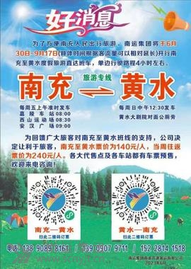 位于重慶石柱土家族自治縣境內(nèi)的黃水森林公園,屬國家級森林公園,年平均氣候在18度左右,是重慶市五個國家級森林公園中最年輕、面積最大、唯一的少數(shù)民族旅游風(fēng)景區(qū)。也是廣大旅游愛好者和夏季清涼避暑休閑的首選旅游景區(qū)。 為滿足廣大旅游愛好者和夏季清涼避暑休閑的出行需求,南充汽車客運(yùn)站從2023年6月30日起開行南充至黃水的旅游直通車,發(fā)車時間為每周五上午08:00時。我們還可以為您提供團(tuán)體出行預(yù)約服務(wù),只為您能度過一個愉快而舒適的夏季!如果您想提前了解相關(guān)情況,歡迎廣大旅客通過電話咨詢:南充汽車客運(yùn)站服務(wù)熱線:0817-3638622 15228141518 溫馨提示: 1.網(wǎng)絡(luò)購票請下載“團(tuán)子出行”或“四川汽車客運(yùn)票務(wù)網(wǎng)”。 2.乘車時請攜帶本人有效身份證件乘車。 (南充客運(yùn)站 彭慶紅) (高客分公司 朱 玲)
