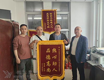 患者乘客張國(guó)民(左二)給營(yíng)山鴻運(yùn)的哥肖建俠(右二)贈(zèng)送大紅錦旗以表謝意。