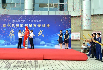 閬中古城機場黨委書記、董事長李廣平(左)與南運集團南部分公司經理周全(右)為設在南部汽車客運站的閬中古城機場南部城市候機樓揭牌。