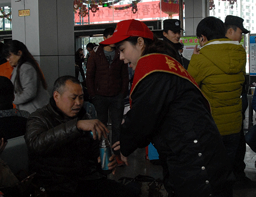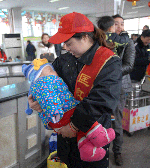 頭戴“小紅帽”的“匡紅艷愛(ài)心班”的站務(wù)人員,身佩大紅授帶,不斷地穿行在售票廳、候車廳。有為購(gòu)票旅客解答疑難的導(dǎo)乘人員,有在咨詢處為旅客不厭其煩耐心解答的咨詢?nèi)藛T,有在車站候車廳為旅客送鮮開(kāi)水的服務(wù)人員,還有嘉陵區(qū)團(tuán)委安排的4名青年志愿者,他們滿腔熱情地扶老攜幼,在行包安檢后幫提行李,讓旅客順利的登上返程班車。一位獨(dú)自一人去墊江的女乘客放心的將自己不到一歲的小寶寶遞交給“小紅帽”站務(wù)人員抱著,以便自己入廁,當(dāng)又抱回自己的小寶寶后,非常感謝“小紅帽”的幫助。